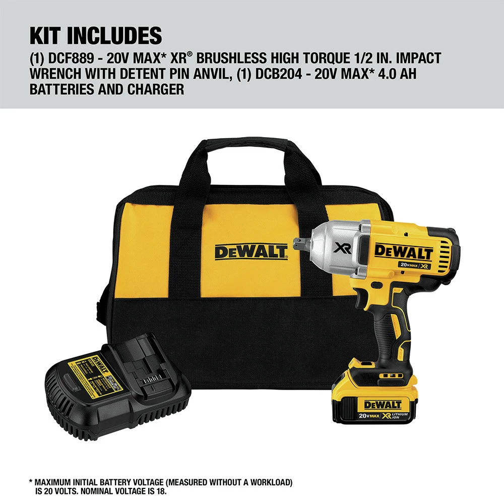 - Includes 1/2 in. (13 mm) impact wrench, 20V MAX XR premium Lithium-Ion battery (4 Ah), charger, and contractor bag