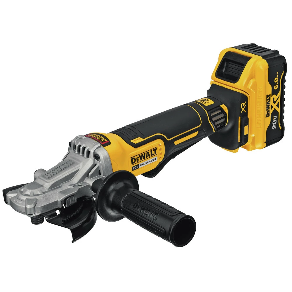 - Kickback Brake engages when a pinch, stall, or bind-up event is sensed and the electronic brake engages with maximum force to quickly stop the wheel, reduce the movement of the grinder and shut the grinder off.