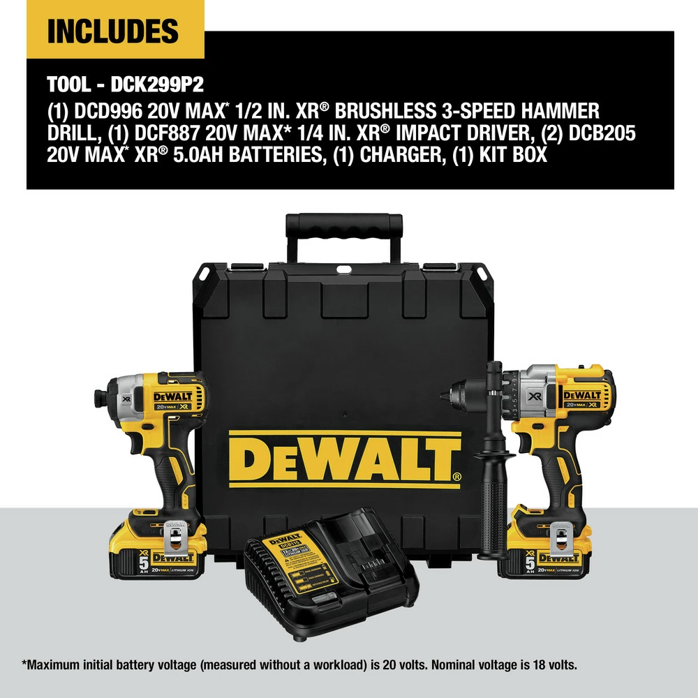 Dewalt DCK299P2 2-Tool Combo Kit – 20V MAX XR Brushless Cordless Hammer Drill & Impact Driver Kit With 2 Batteries (5 Ah)