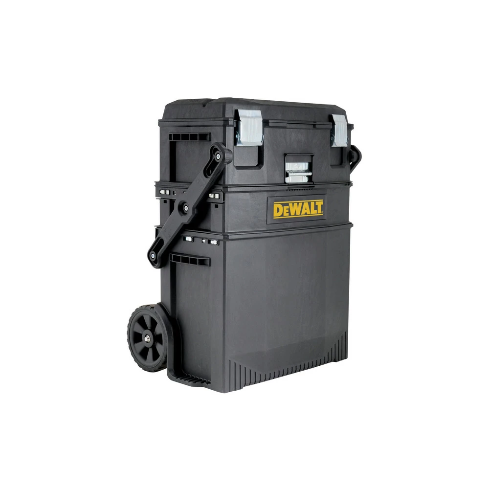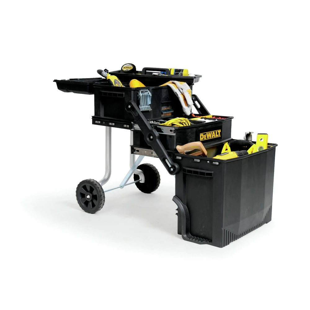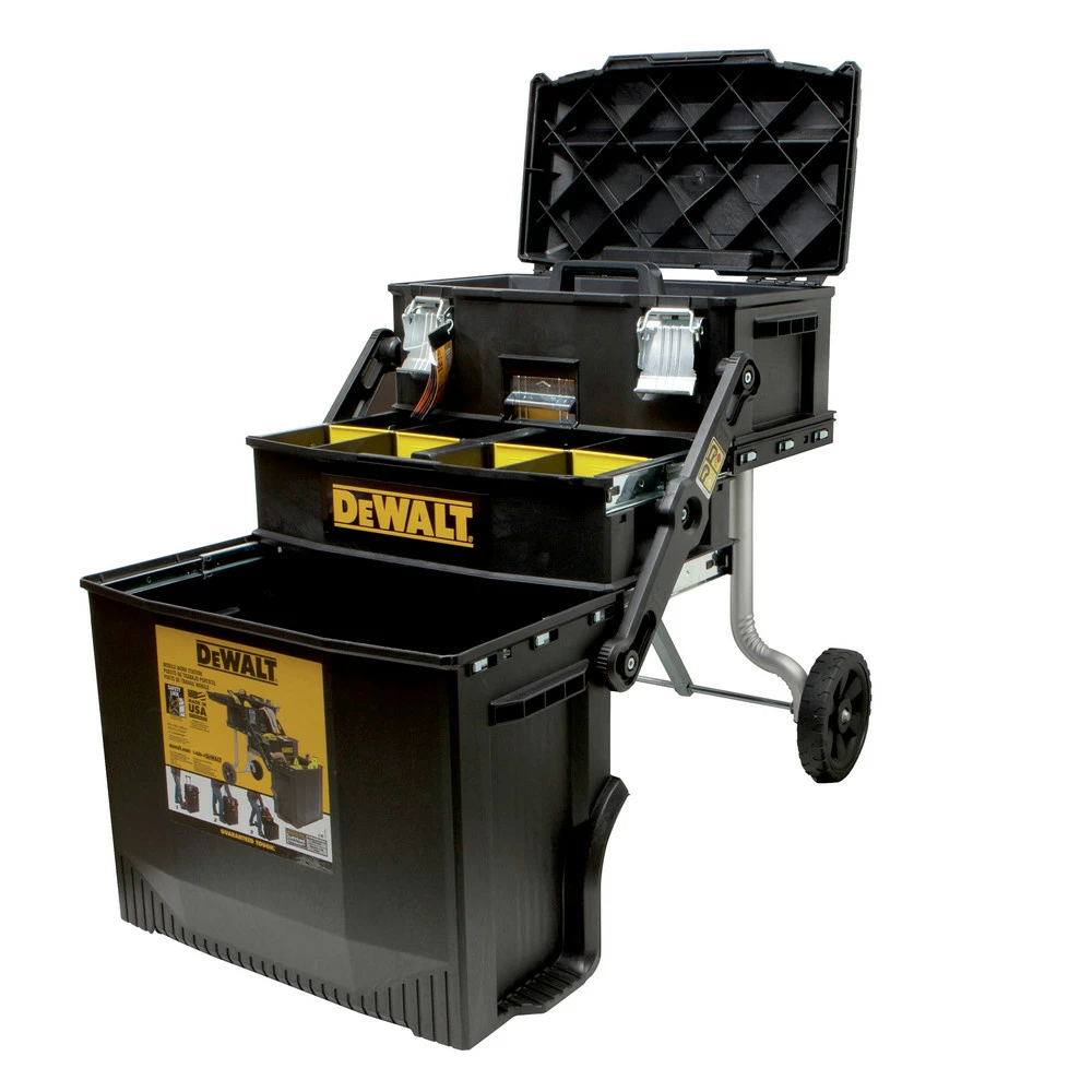 - 4 work levels top tool box and tray that can be placed on opened up lid, mid organizer section, and large bottom bin for power tools